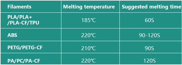 2.Filament Temperature Parameter Table