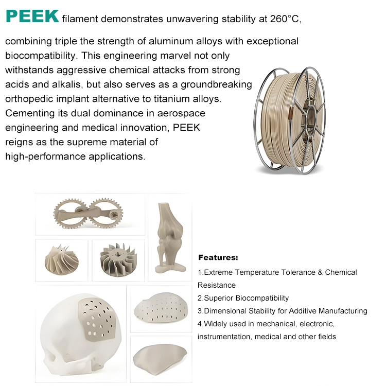 Peek filament demonstrates unwavering stability at 260°C combining triple the strength of aluminum alloys with exceptional biocompatibility. This engineering marvel not onlywithstands aggressive chemical attacks from strongacids and alkalis, but also serves as a ground breaking orthopedic implant alternative to titanium alloys.Cementing its dual dominance in aerospace, engineering and medical innovation, PEEK reigns as the supreme material of high-performance applications.