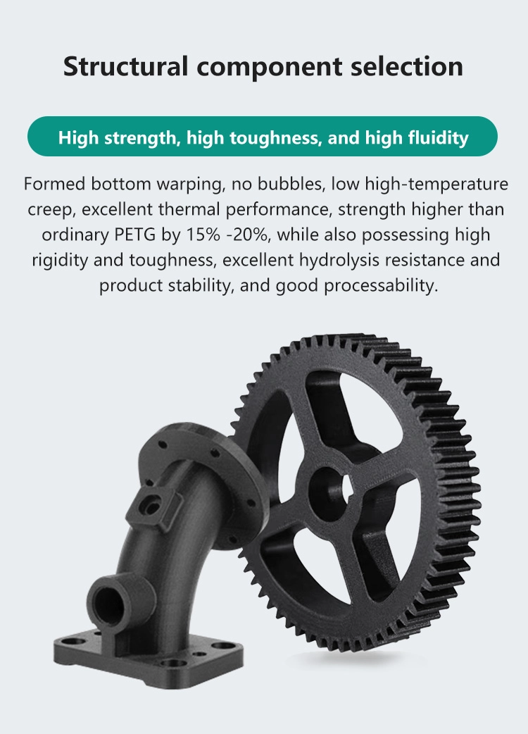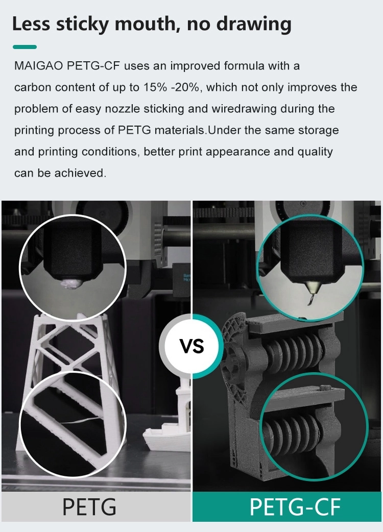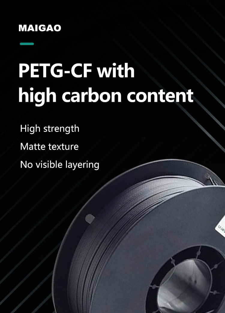 The PETG-CF of MAIGAO belongs to a type of PETG filled with carbon fibers, with a carbon content of up to 15% -20%.lt improves the anti warping performance of filaments, improves the quality of the suspension surface, high frosted texture and toughness.